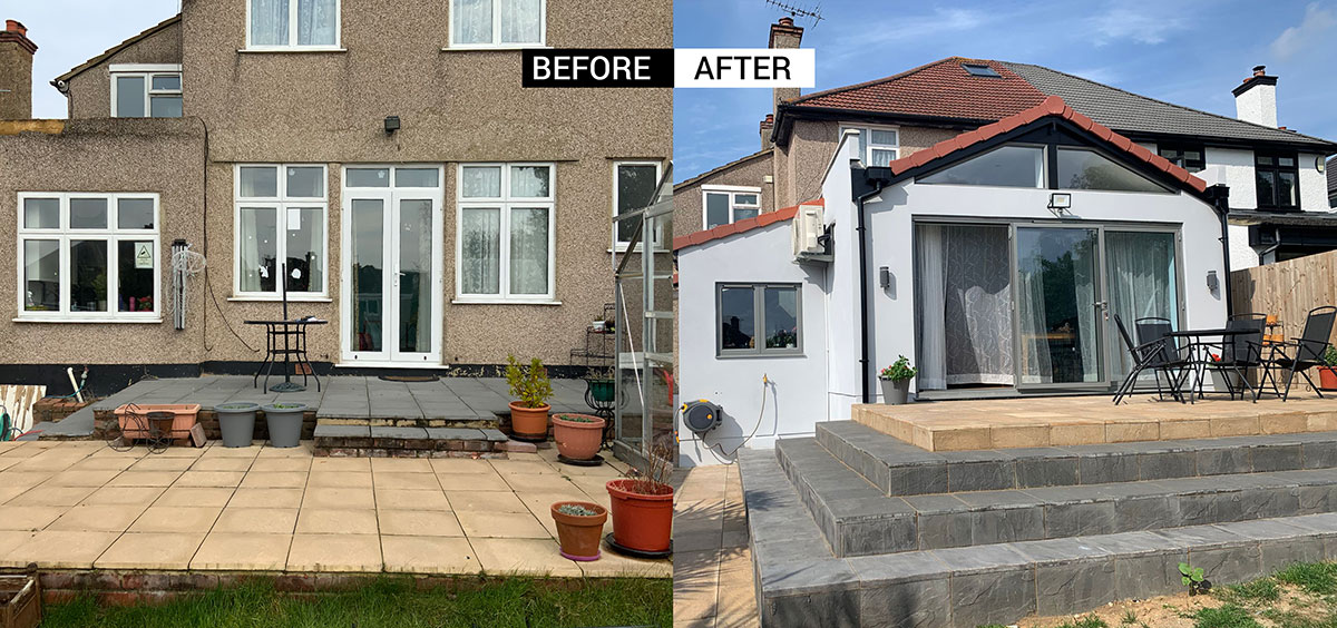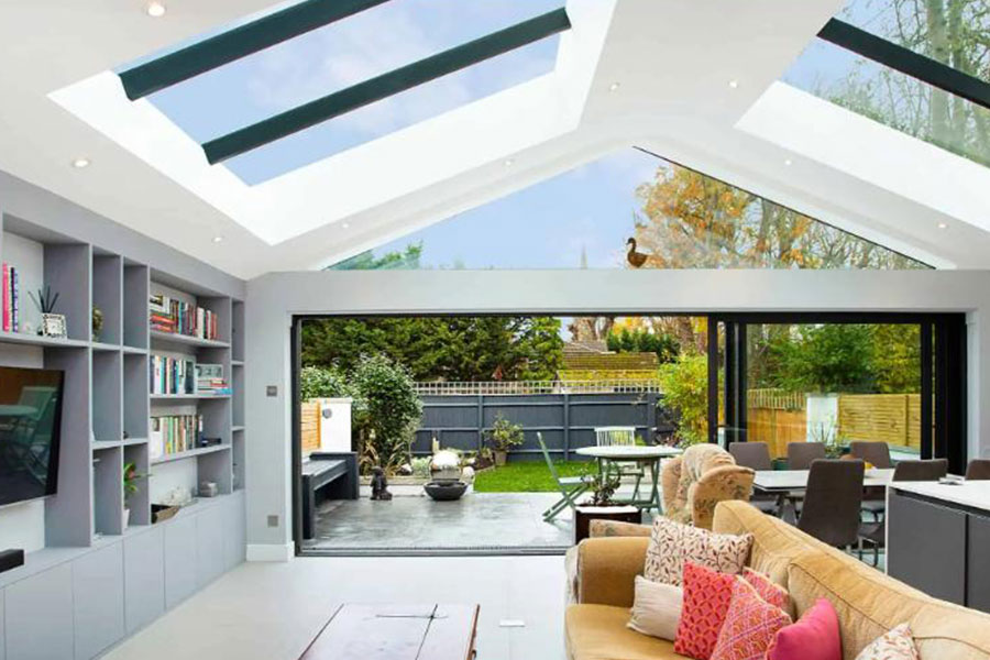 - The large sliding doors and structural roof glazing provide plenty of natural light in summer and give the space a bit of sparkle in the winter.